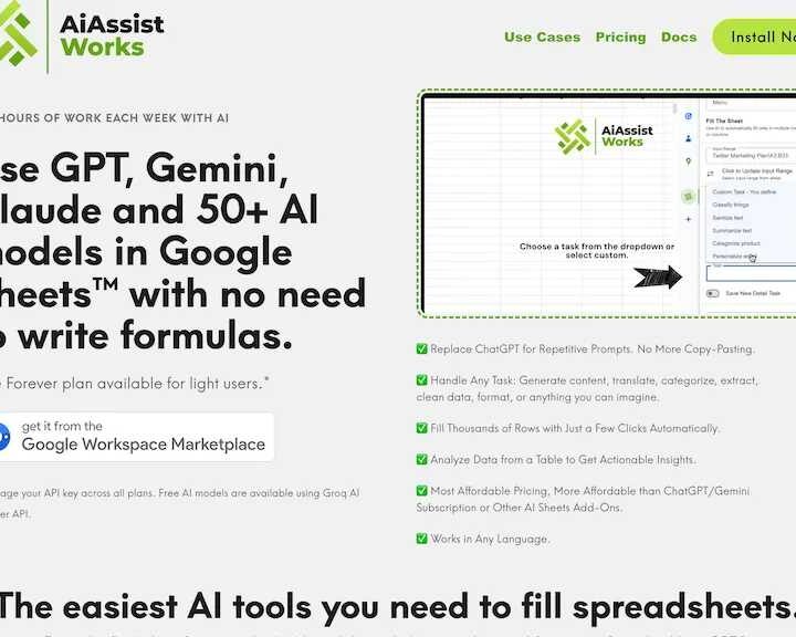 AiAssistWorks is the cutting-edge AI-powered add-on for Google Sheets, designed to empower users with advanced AI capabilities directly within their spreadsheets. Say goodbye to manual formula writing and tedious copy-pasting. By integrating seamlessly with leading AI models like OpenAI’s GPT, Anthropic’s Claude, Google Gemini, OpenRouter, and Groq, AiAssistWorks simplifies complex tasks, boosts your productivity, and unlocks the potential of AI for everyone.