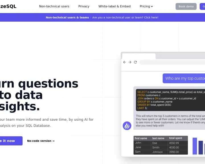 BlazeSQL AI is your gateway to intuitive data analytics, designed to extract valuable insights from SQL databases without requiring any programming expertise. By seamlessly integrating an AI-powered chatbot directly with your SQL database, BlazeSQL empowers users to pose questions in natural language and receive precise data, stunning visualizations, and even automatically generated SQL code. It’s the perfect tool for anyone looking to simplify complex data exploration and accelerate informed decision-making.