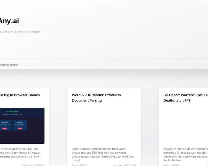 CreateAny.ai stands out as a cutting-edge, cloud-based AI platform designed for users who want to build digital products without writing code. Whether you aim to design stunning websites, develop functional applications, or create engaging games, CreateAny.ai empowers you to bring your visions to life with unparalleled speed and simplicity. By leveraging advanced AI technology, you can simply describe your project in plain text, and the platform handles the complex development process, making it ideal for rapid prototyping and accelerating time-to-market.
