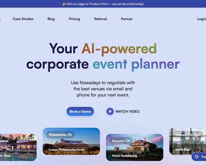 Revolutionize your corporate event planning with Nowadays, the cutting-edge platform leveraging advanced Artificial Intelligence (AI). Designed for efficiency and effectiveness, Nowadays transforms how you manage events, offering expert-level insights to secure optimal venue bids, discover top destination and activity recommendations, and conduct comprehensive global venue searches. Experience significant time and cost savings while ensuring seamless event execution and exceptional guest experiences.