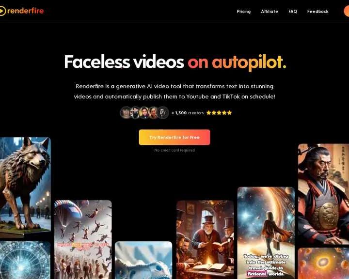 Renderfire AI is a cutting-edge generative AI video tool designed to revolutionize content creation. It empowers users to effortlessly transform written content into engaging, faceless videos. With an intuitive interface, users can craft, manage, and edit entire video series, maintaining complete control over their creative output.