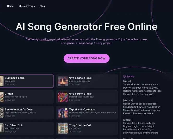 SongGenerator.io is your premier AI music generator, a cutting-edge platform that empowers users of all skill levels to create original, high-quality, and bespoke song tracks effortlessly. Leveraging advanced artificial intelligence, this tool simplifies the entire music creation process. Whether you’re a professional musician or a hobbyist, SongGenerator.io allows you to transform your ideas into reality by simply inputting text descriptions, lyrics, and selecting preferred musical styles. Experience the future of songwriting and music production.