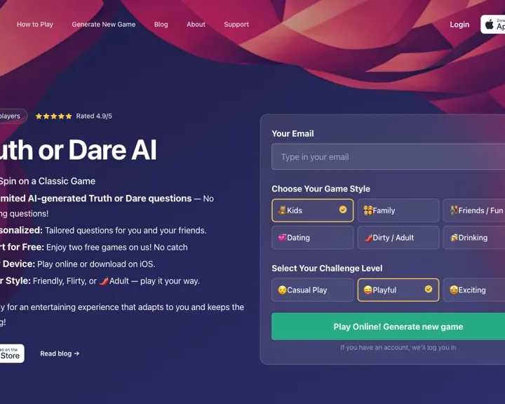 Truth or Dare AI is an innovative, AI-powered tool that reimagines the classic game of Truth or Dare. Forget repetitive questions; our platform offers an endless library of unique, AI-generated prompts designed to keep the fun fresh and engaging. With an intuitive interface, you can easily customize your gameplay to perfectly match your preferences and group dynamics. Whether you’re hosting a vibrant party, planning a team-building event, or simply looking for solo entertainment, Truth or Dare AI adapts seamlessly to provide bespoke questions and challenges that guarantee laughter, intrigue, and unforgettable memories. Discover the future of party games with personalized AI experiences.