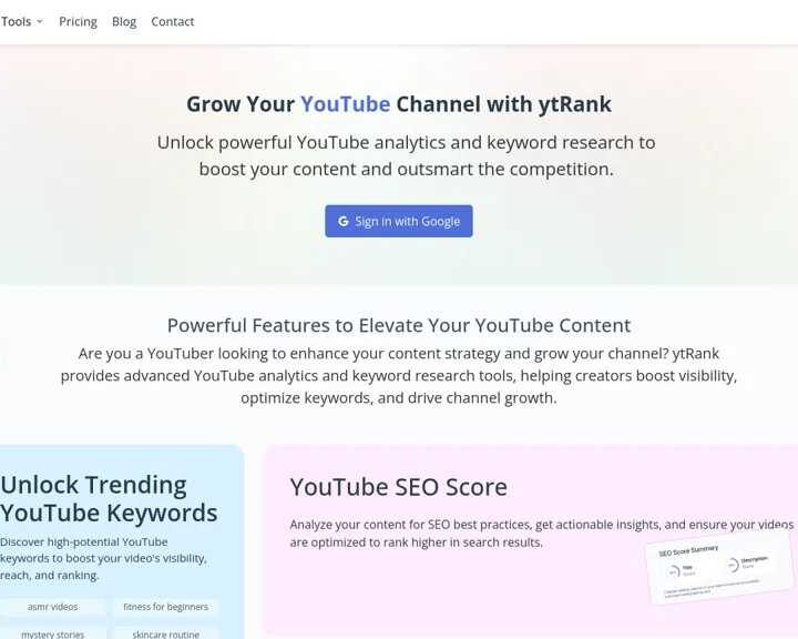 ytRank.ai is a cutting-edge, AI-powered platform built to equip YouTube creators with essential tools for optimizing their content and accelerating channel expansion. It focuses on maximizing YouTube success through a suite of intelligent features, ensuring your videos reach their full potential and your channel achieves greater visibility and audience engagement.